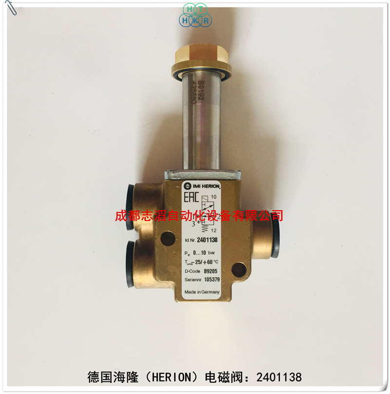 2401138德国海隆IMI HERION电磁阀技术参数:管接式的阀、黄铜阀体、电磁线圈组A+B、接口尺寸为1/4NPT、工作压力0-10bar、材质阀座密封圈NBR、手动应急控制无、阀体重量0.65kg!
