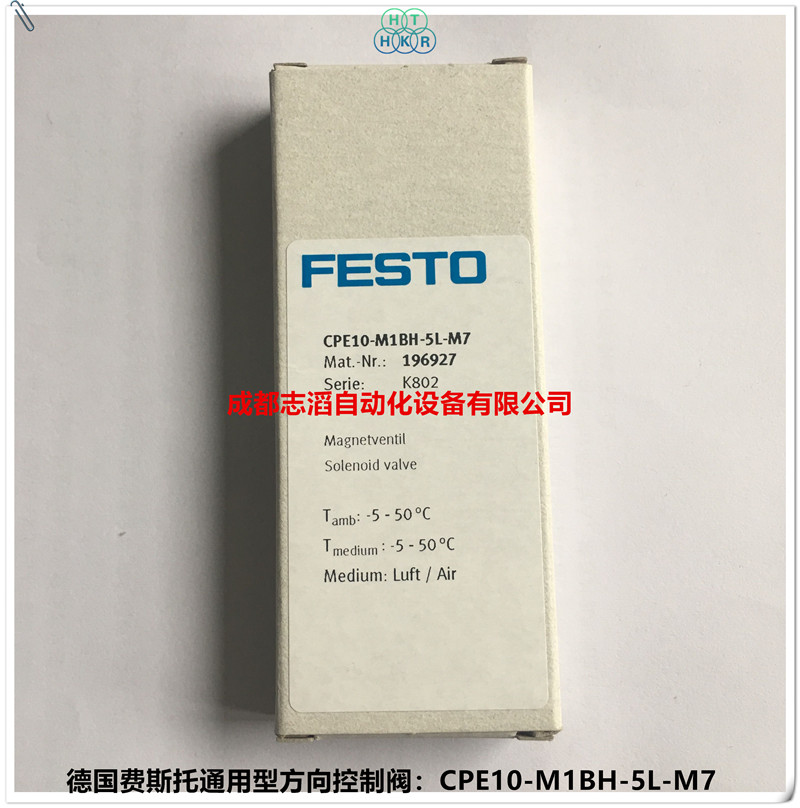 CPE10-M1BH-5L-M7德国费斯托FESTO通用型方向控制阀技术参数:订货好196927、阀型号管式阀、规格10mm、阀功能2位5通、单电控、先导气源内部、气动接口M7、电接口样口是ZC、公制螺纹、工作电压24VDC!