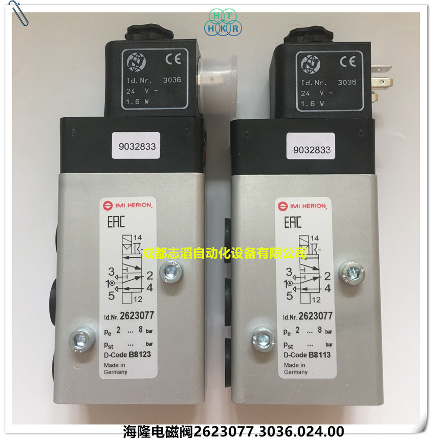 2623077.3036.024.00德国海隆IMI HERION电磁阀技术参数:接口尺寸1.3.5为G1/4、2.4为法兰、2为5通、单电控、6mm通径、工作压力2-8bar、产地为德国或者捷克、Kv值1.2立方米/h、阀体重量0.55kg、配海隆普通线圈3036、电压为24VDC!应用行业:电厂