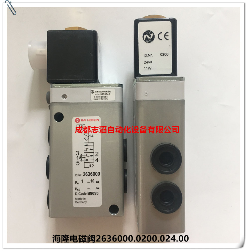 德国海隆(IMI HERION)先导电磁控制阀26360,80207管接式共同规格:介质经过滤的润滑或非润滑压缩空气、工作方式先导电磁控制-滑阀、接口尺寸G1/4,G1/2、工作压力可达10bar、流向固定、安装任意,减压电磁线圈置于顶部、通径8mm,12mm、工作温度-10到60摄氏度;材料阀体阳极氧化铝、先导头,法兰塑料、密封件丁晴橡胶、