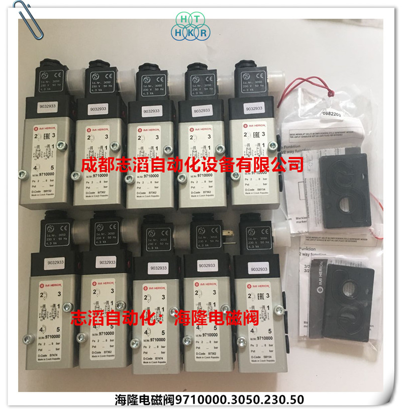 IMI HERION(海隆)97100系列先导式软密封滑阀现货型号:9710000.3050.230.50(技术参数接口尺寸1口为G1/4、3和5口为G1/8、2和4位为法兰、功能NC、驱动方式电控/弹簧、Kv值为0.75立方米/小时、阀体重量0.25kg)、配海隆普通线圈3050、电压为AC220V、产地为捷克共和国!