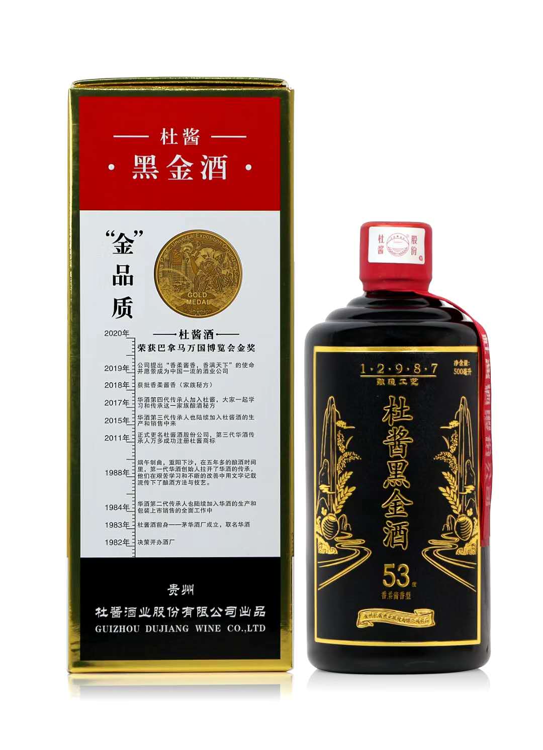 杜酱黑金纯粮酒采用本地红缨子高粱、小麦、水为原料,秉承古法酿造工艺而成,有酱香突出、幽雅细腻、酒体醇厚、回味悠长、 空杯留香等特点