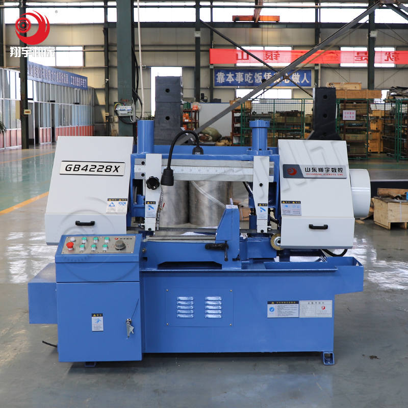 GB4228X角度带锯床(可调0-45度或者0-60度)应用于切割钢胚、铁板、无缝钢管及大型轴类零件,亦可在选取适当的工艺参数后,切割各种黑色或有色金属材料。具有可靠性高、效率高和高刚性等显著特点,可代替昂贵的进口设备。