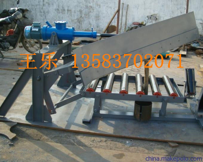 电液动犁式卸料器以电液动推杆为动力源,带动框架前进,完成犁头下落,并支承平托辊,犁刀下缘与胶带贴合,完成卸料。犁式卸料器完华后,框架后退,犁头上抬,变形托辊恢复槽形,胶带则则恢复槽形,物料平稳通过。