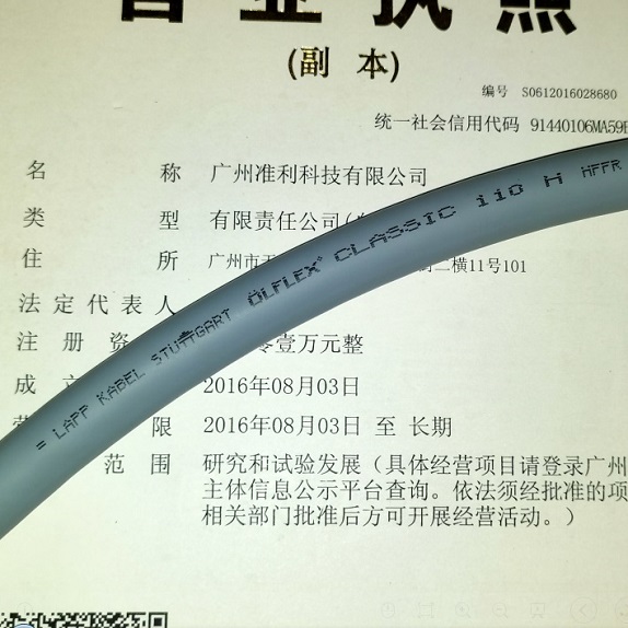 广州准利科技有限公司✆13539761159☎020-62208903✉13539761159@163.com㊣宗①手货源工厂供应LAPPKABEL ÖLFLEX CLASSIC 110 H 18G1,5 N控制电缆OLFLEX-CLASSIC-110H-18G1.5mm²,批次:6340858035 U I LAPP GMBH PROCESSED WIRE RESPOOLED Issue No:596,542 VOLT:600 V INSUL:15mil AWM STYLE 21089 600V 75℃ AWM USE INTERNAL WIRING OF APPLIANCES AND EXTERNAL INTERConNECTION OF ELECTRonIC EQUIPMENT无卤素阻燃、高柔性、耐油,易于安装;P/N:10019937 =LAPPKABEL STUTTGART ÖLFLEX® CLASSIC 110 H HFFR IEC 60332-3 18 G 1,5 <16AWG/18c> CE UL AWM style 21089 75℃ 600V E63634广泛用于机场与车站等公共设备建筑与安装工程,工业机械,空调安装,舞台,采用多股细紫CU铜丝束合软导体,无卤芯线绝缘,无卤外护套,银速企屏蔽RAL 7001,符合 EN 50525-2-11/EN 50525-2-51