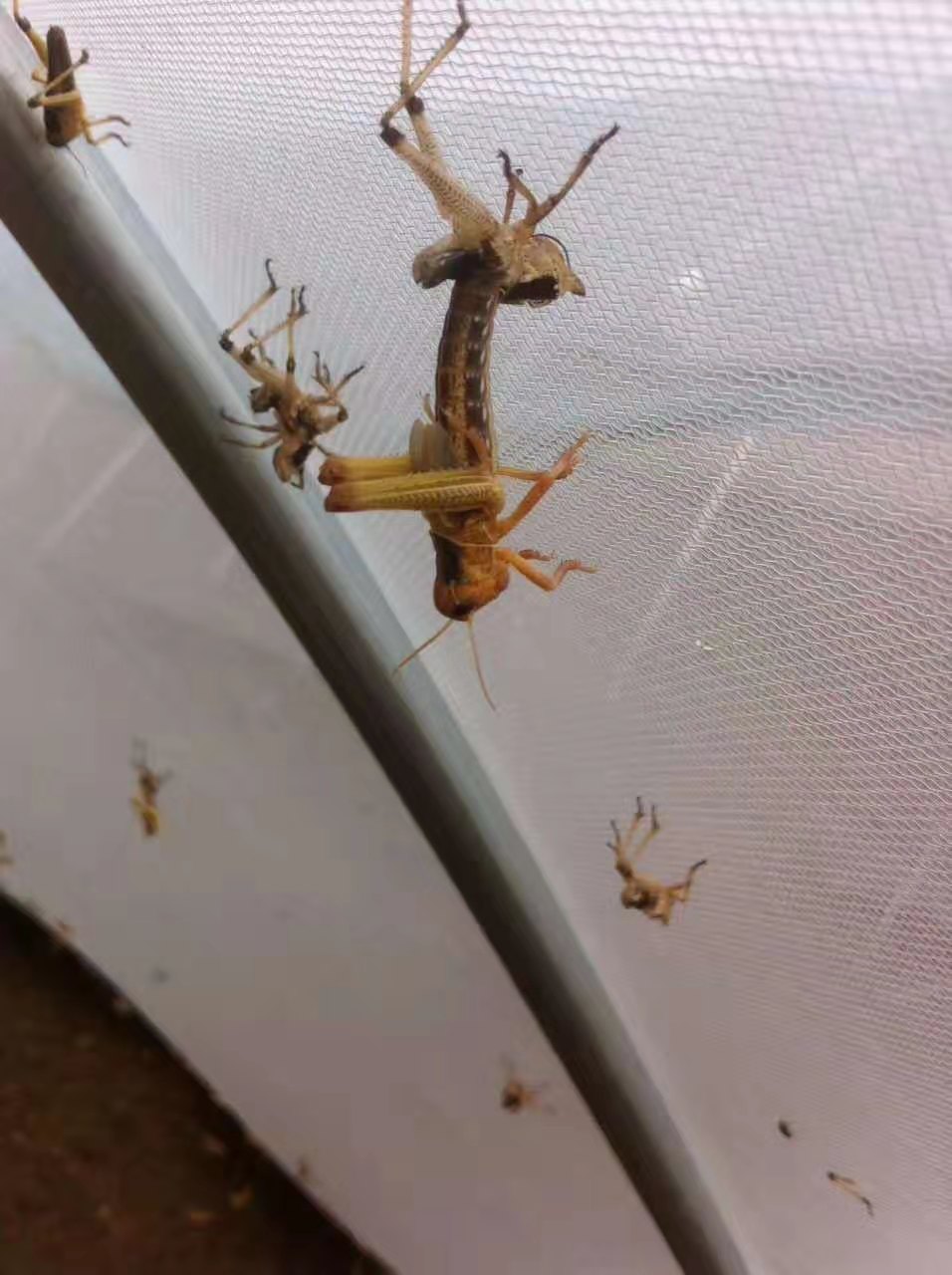 ⑴蝗虫取食量很小,且喜欢取食鲜嫩植物,此期蝗虫非常纤弱,应注意防雨,以防淹死蝗虫。