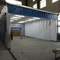 伸缩移动喷漆房整体为框架传动结构,每组框架间均有阻燃PVC布密封连接,安装快捷、外形美观,结构精巧,使用方便,制造成本低,!工作中房体沿地面铺设的轨道前后伸缩移动,采用两边分别驱动,互相连锁的方式运行,前后安全限位控制,机械运行安全稳定,操作简单,使用方便。工作区内安装有防爆照明灯,可满足生产中的照明需要!可根据客户的实际生产需要定做各种型号的非标尺寸;在无需进行喷漆流程的工作时间内,可将前室并拢,节省空间场地作为其他与喷漆交叉作业的工序所使用。