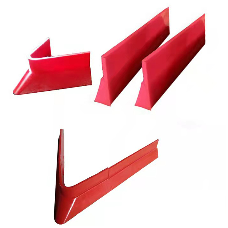 聚氨酯材质的卸载器犁头由三部组成。一个弯角:不同宽带的犁头的弯角是相同的两个侧边;不同带宽的犁头,侧边不同。