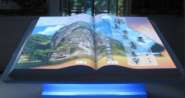 采用动作感应技术和计算机多媒体技术实现虚拟视觉效果书本翻书,游客只需站在电子书的前面,在空中做出左右波动的手臂,它前面的电子书将随着手臂的摆动而前后转动。