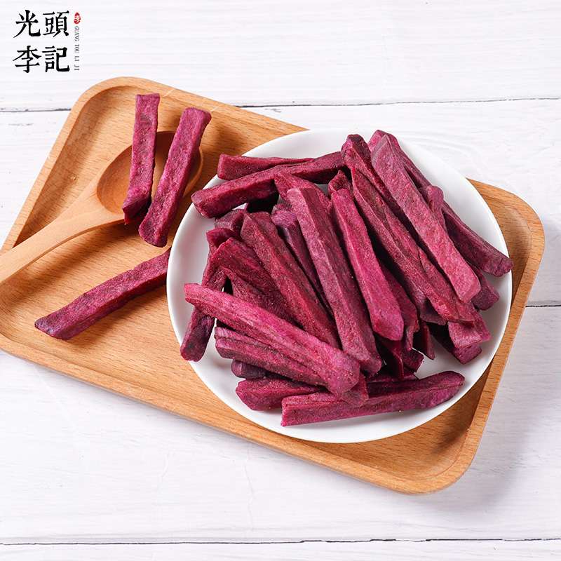 新鲜紫薯,制作成紫薯脆保存了新鲜紫薯天然的色泽、形态和风味,高颜值,香脆爽口。