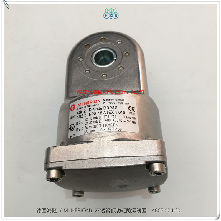 4802.024.00德国海隆(IMI HERION)不锈钢低功耗防爆线圈技术参数简介:线圈型号为4802、线圈电压为24V直流、线圈功率为0.8W、防护等级为EEXDMBIICT4/T6或EEXMEIIT5/T6IP66T100℃、环境和工作温度范围类别II2G气体-40到80摄氏度(T4)-负40到70摄氏度(T6),类别II2D灰尘T100摄氏度、产地为德国、线圈重量1.2千克