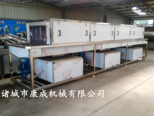 周转箱通过传送带送入机器,在第一段清洗中,用38℃~45℃(温度自动控制)的热水通过卫生级的循环水泵输送到立体设置的喷淋管,再通过可拆式的多个喷淋头对箱体进行立体式的冲刷清洗,清洗水经过滤后循环使用。在第二段清洗中,用82℃~87℃(温度自动控制)的热水通过卫生级的循环水泵输送到立体设置的喷淋管,再通过可拆式的若干个喷淋头对箱体进行立体式的冲刷清洗,清洗水经过滤后流入循环水箱循环使用。在第三段漂洗中,再用清水喷淋冲洗箱体四周,喷淋后的水流入第一段循环水箱重复利用。清洗后的周转箱被另一段输送线送入风干机对其四面用强风吹干、烘干后进入生产线。