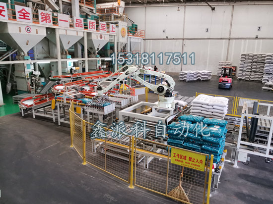 今天给大家先大致讲一下装袋机器人,它是机座固定回转式,机身可360度旋转,由机械手完成包装袋的输送、开袋、计量、充填、缝袋和给出堆码。这是一种自动化较高的包装机器人。