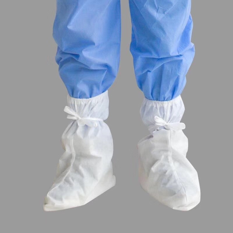 在使用之前将隔离鞋套展开,套上鞋套后,将袜子、裤脚塞入隔离鞋套后用绑带固定。经多人实际操作验证东贝一次性无纺布隔离鞋套在一次性使用中耐磨、防水、透气、隔离型好、高筒鞋套不下滑。