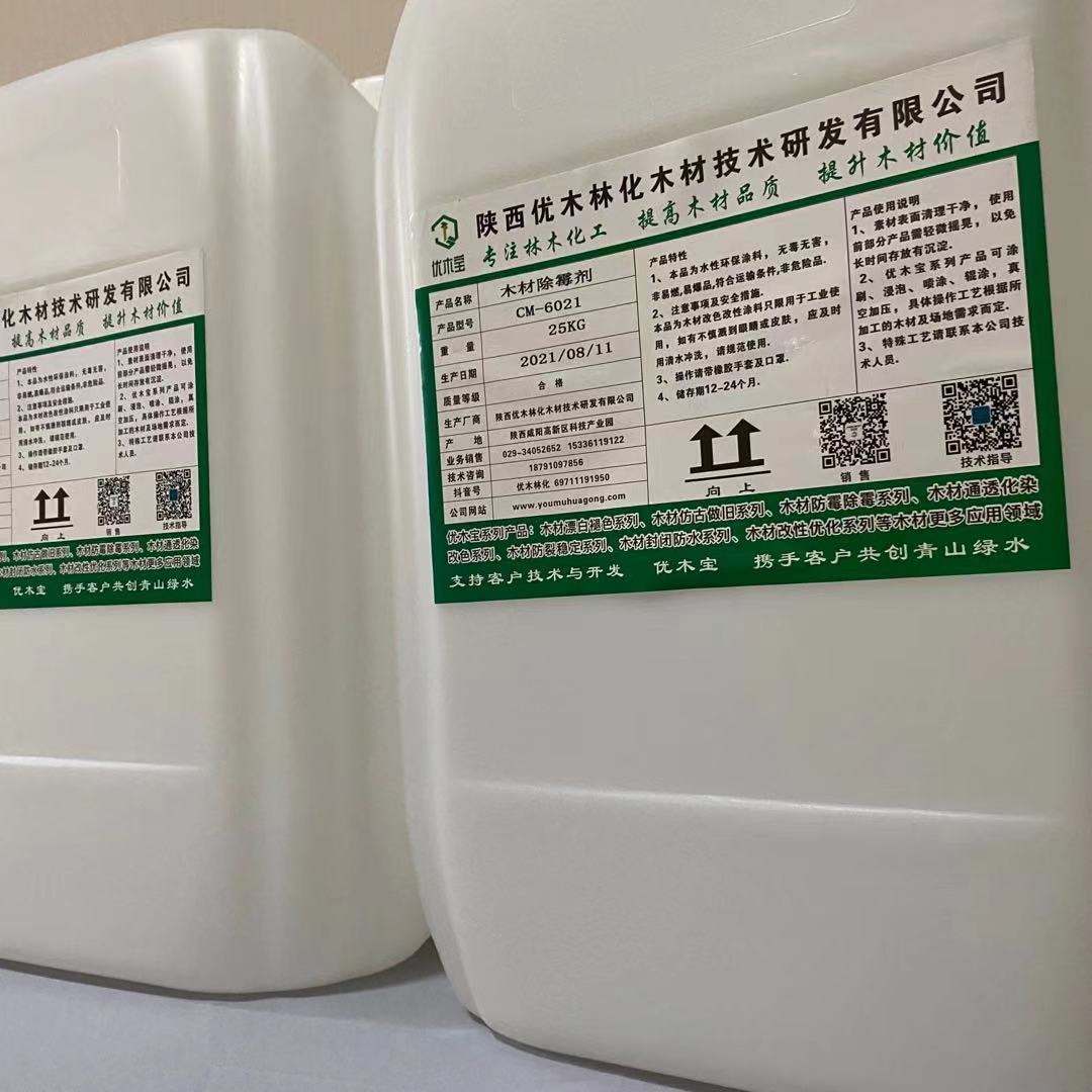 优木宝环保型木材除霉剂CM-6021是陕西优木林化木材技术研发有限公司研发升级的一种新型木材霉变消除剂,具有高浓度,高渗透性,除霉快,稳定性好,操作简单,无异味,无有害物质的一种升级产品,在木材因气候原因所造成的木霉,蓝变,白曲霉,黑曲霉,绿毛霉,红斑霉等多种不定因素的霉变,有很好的效果.
