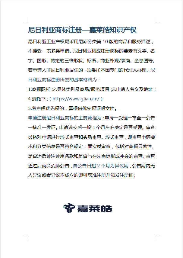申请注册尼日利亚商标的主要流程为:申请一受理一审查一公告一核准一发证。申请递交后一般1个月左右决定是否受理。审查员将对申请进行形式审查和实质审查。形式审查,即审查申请要求和分类信息是否符合规定;而实质审查,包括对商标显著性、是否违反禁注禁用条款和是否与在先商标形成冲突的审查。审查通过后就会安排公告,自公告日起2个月为异议期,公告期内无人异议或者异议不成立的即可获准注册并颁发注册证。