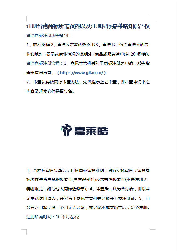 注册台湾商标所需资料以及注册程序嘉莱皓知识产权