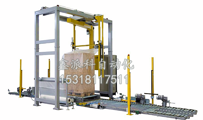 6、带顶膜包装的环形轨道式薄膜缠绕机,将旋转的运动的薄膜几构嵌入在环形轨道上,克服了旋臂缠绕机顶部容易磨损的缺点,将薄膜几构受力点平均分配在环形轨道的每一点接触面上,使得缠绕机的运行速度能够提高。该缠绕机带有顶膜自动包装功能,能够实现货物的防尘和防水包装。