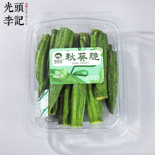 山东光头李记食品有限公司苗蔬蔬透明盒系列秋葵脆,VF工艺制作而成的秋葵脆,采用极简透明的包装,可以更加直观的看到产品的状态,外形、颜色、品质一目了然,能直接突出产品的优势和卖点,既能体现出果蔬脆的自然美感,又在视觉上直接让顾客对商品有一定的认知,便于顾客识别选购。透明开窗适合陈列展示,高颜值的果蔬脆色彩鲜艳,透过透明的包装,更能吸引顾客的目光尤其是小朋友的注意力,用颜值吸引目光,用美味征服人心。