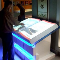 投影机将画面投影到书本模型上,利用红外感应捕捉访客的动作,并将动作传送到计算机进行处理。观众可以看到一本书开始打开。通过两个按钮,观看者可以选择书的内容,并通过投影仪立即投影书本的内容;当观众站在书模型前面做手势翻页动作时,书籍阅读器检测到手势的方向,并且计算机会立即控制书本做翻页,向前或向后翻;用声音效果配合翻页。