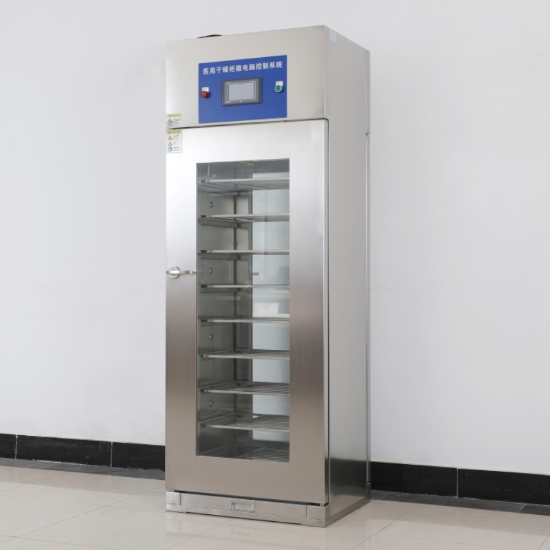 干燥柜内胆及外壳均采用304优质不锈钢,电源220V,50HZ;进口高压风机,噪音低,风力强;双开门大视窗中空钢化玻璃门可随时观察内部情况,精确的温控系统,可将温度误差控制在1度以内,烘干温度在室内温度-90度可调,一般建议65-75度为。全电脑自动控制,无需专人看管,结束自动报警,容量规格为:300L、400L、500L、600L、主要看满足医院的各类腔镜、显化瓶、手术刀、止血钳、麻醉导管、换药管、各种盘子,圆桶、测压器等器械和物品在灭菌签的彻底干燥。