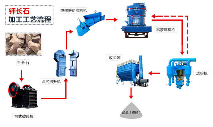大块钾长石由车辆运送至原料仓,后由铲车将物料送至颚式破碎机处理,破碎到15-30mm左右即可;破碎后的小块钾长石由斗式提升机送至料仓,再经振动给料机将其均匀定量的送入雷蒙磨粉机内进行研磨;粉磨后的钾长石粉经选粉机进行分级,不合格的粉子被选粉机分级后返回主机重新研磨;符合细度的粉随气流经管道进入收尘器内进行分离收集,收集的成品粉经出料口由输送装置送至成品料仓,从而完成钾长石的磨粉作业。