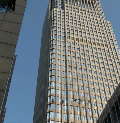 在对玻璃幕采用刮洗,以保持其光洁明亮。