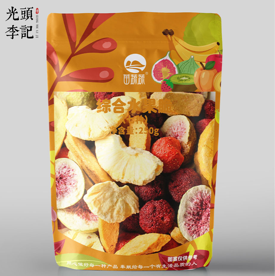 山东光头李记食品有限公司苗蔬蔬阴阳袋系列综合水果脆,FD工艺制作而成的综合水果脆,采用极简透明的包装,可以更加直观的看到产品的状态,外形、颜色、品质一目了然,能直接突出产品的优势和卖点,既能体现出果蔬脆的自然美感,又在视觉上直接让顾客对商品有一定的认知,便于顾客识别选购。透明开窗适合陈列展示,高颜值的果蔬脆色彩鲜艳,透过透明的包装,更能吸引顾客的目光尤其是小朋友的注意力,用颜值吸引目光,用美味征服人心。