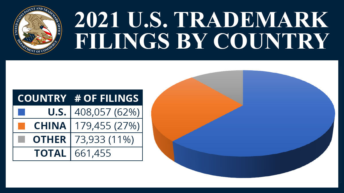 2021年,来自中国企业的商标申请占美国商标申请总量的27%。