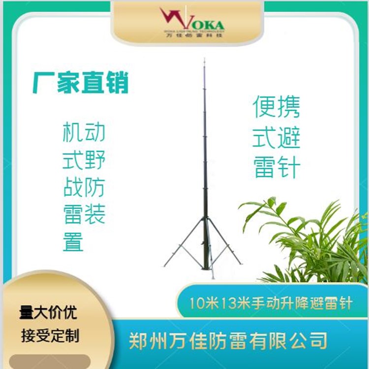 郑州万佳防雷有限公司是一家专注于防雷、升降设备、接地材料的研发生产、工程设计施工、检测维护和技术咨询服务为一体的现代化搞科技企业。主要产品有:野zhan避雷针、升降避雷针、便携避雷针、快装式避雷针、铝镁合金升降避雷针、手动升降避雷针、电动升降避雷针、车载升降避雷针、可移动升降避雷针升降杆、通讯升降杆、手动升降杆、天线升降杆、电动升降杆、自动升降杆、通讯升降天线杆、升降桅杆、拖挂式应急通信升降杆、移动通信升降杆、通讯升降塔桅杆等产品的升降杆避雷针厂家,另还可根据不同需求设计生产各种升降杆,欢迎各界朋友莅临参观、指导和业务洽谈。