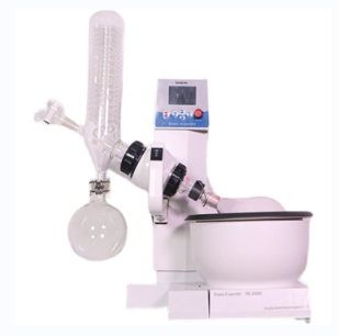 实验室蒸馏提纯蒸发器,旋转蒸发仪工作原理:蒸发瓶恒速旋转,水浴锅恒温加热,在此条件下:物料在蒸发瓶内壁形成大面积均匀薄膜蒸发,在真空条件下可以提高蒸发效率(需连接真空装置),溶媒蒸汽经玻璃冷凝盘管时冷却成液体(需连接冷却装置),回收于收集瓶。产品使用需配套真空装置(循环水式、旋片式、隔膜式等真空泵),冷却循环装置组成系统装置。