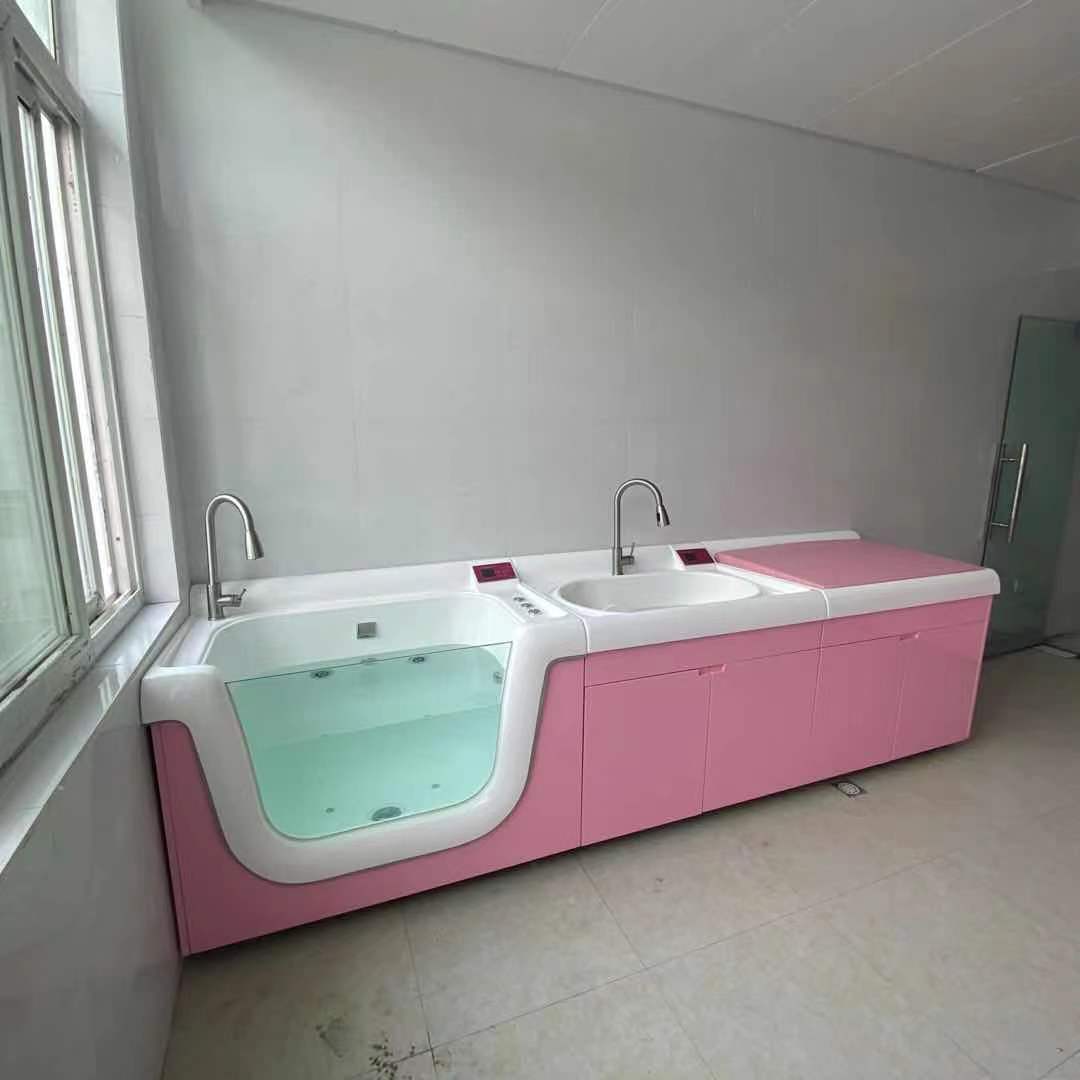 婴儿洗浴设备常见于妇幼保健院,医院产科,月子中心,母婴会所等,为刚出生的宝宝提供优良的洗浴环境。此产品为定制产品,需根据房间尺寸定制方案。、婴儿洗浴中心由婴儿洗礼池,婴儿游泳池,护理平台,扶触软包台,洗手池等组成。洗礼池和游泳池,洗手池,护理平台,转角平台都采用面层为优质的A级PMMA高分子复合材料一体成型,表面细菌残留量远远低于不锈钢,人造石,陶瓷盆和其他普通塑料。婴儿洗澡池底部圆滑突起设计;给婴儿一防滑支撑点,防止婴儿在池内滑动,造成意外呛水。