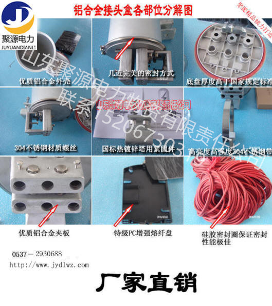 由“山东聚源电力物质有限责任公司”生产的新型改进型卡箍固定铝合金接头盒,解决了原来产品紧固过程中出现的漏气,密封不严的弊端,几近完美的密封方法,更具有防腐、防水、防尘、抗冲击、寿命长、价格优。安装使用方便等优点,是接续盒更新换代和施工单位光缆线路安装施工的选,欢迎新老客户选购!