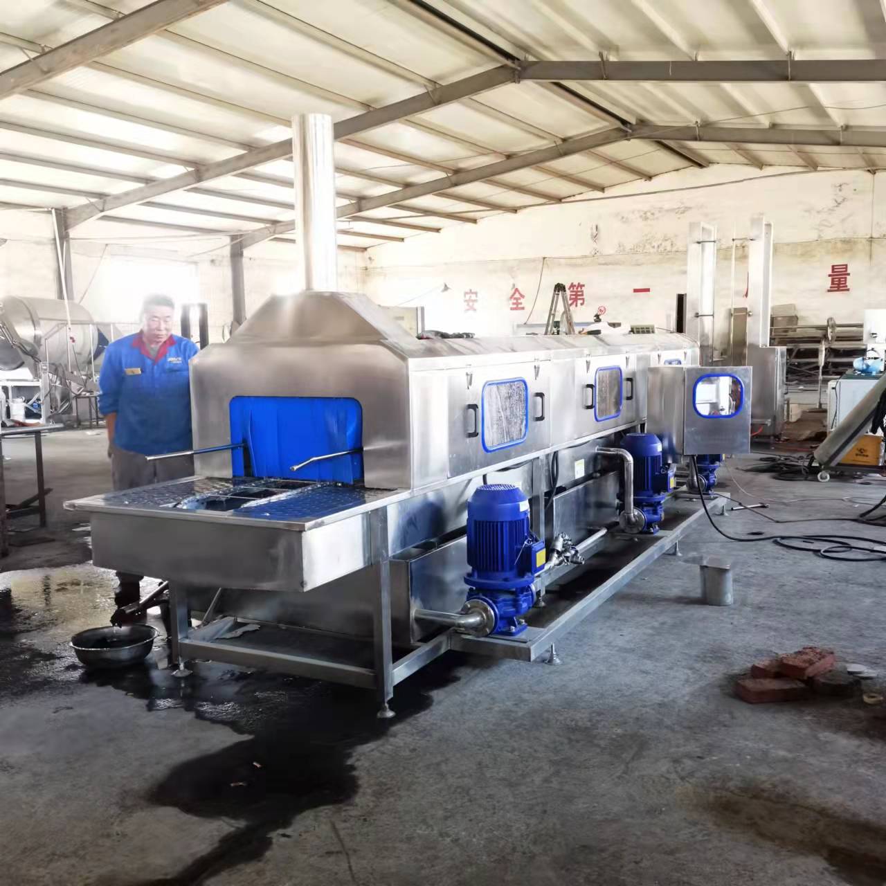 需清洗的周转筐由不锈钢链条输入清洗机中,依次通过碱水→高压热水→常温自来水→消毒水→常温风刀去水等多道工序,将筐子清洗干净,同时完成杀菌及风干;特殊筐子清洗时可在热碱水清洗段后加配毛刷,对筐子底部及左右两侧进行刷洗,提高清洗效果;采用连续式清洗,以提高清洗效率。