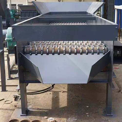 物料由机器顶端入多级联动滚轴筛的第1-3轴,通过电机驱动带有不规则形状装置(轴盘)的滚轴进行翻转运动,各轴之间有间隙,靠镶嵌在轴上的轴盘托起大块物料向出料口方向运动,小于各轴或轴盘间隙的小粒度物料则逐步落于机器底部由皮带机或收缩斗排出,滚轴上方的物料运动到末端由出料口排出,从而起到粗细物料分离与筛分的目的。