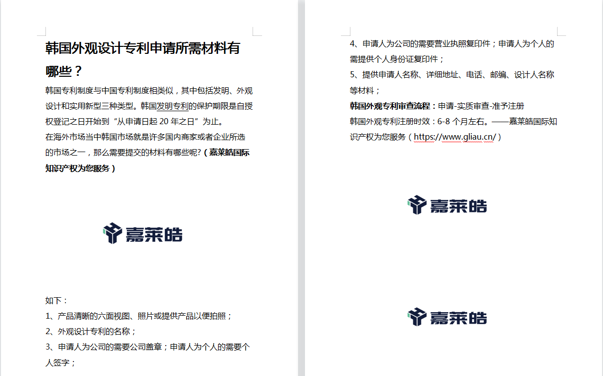 韩国外观专利注册时效:6-8个月左右。——嘉莱皓国际知识产权为您服务