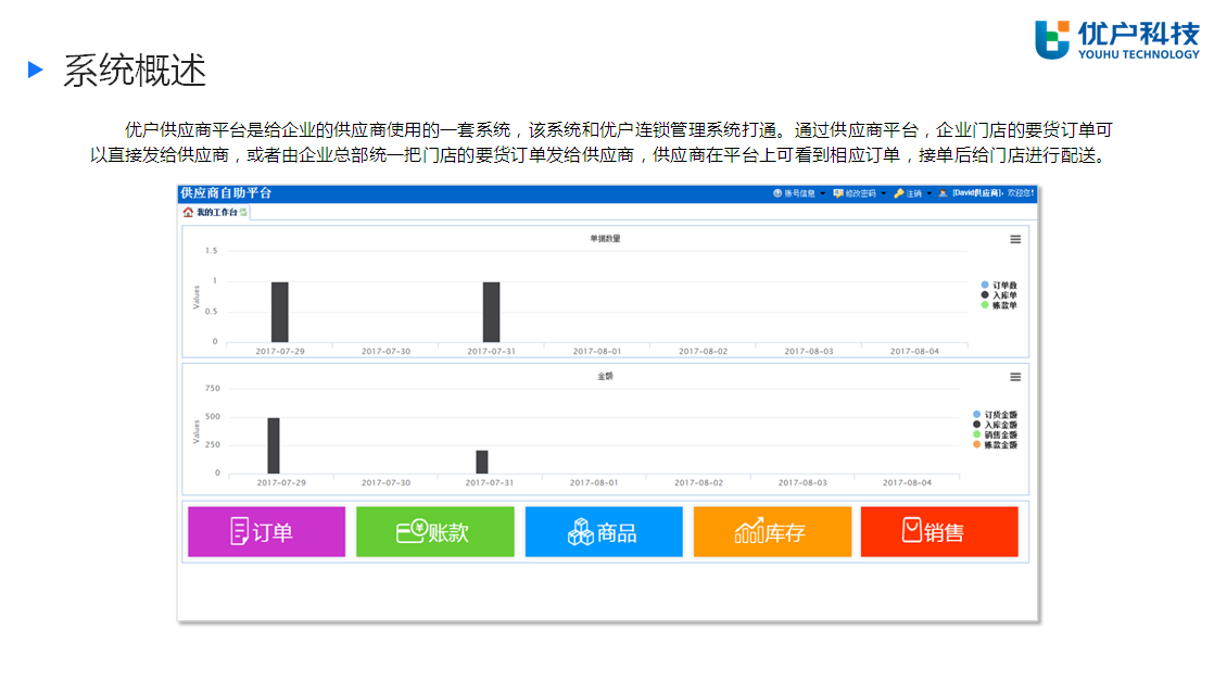优户供应商自助平台是给企业的供应商使用的一套系统,该系统和优户连锁管理系统打通。通过供应商自助平台,企业门店的要货订单可以直接发给供应商,或者由企业总部统一把门店的要货订单发给供应商,供应商在平台上可看到相应订单,接单后给门店进行配送。