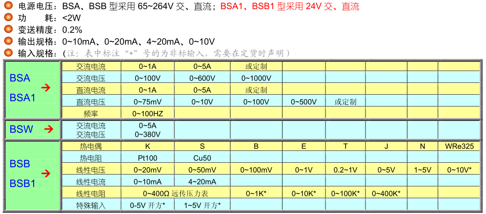 BS系列变送器分为底座安装式普通型(A型)和导轨式安装智能型(B型),以及功率变送(W型)三个类型,其中B型变送器采用单片微处理器设计,内置二十多种线性、非线性输入规格,可用于温度、湿度、压力、液位、瞬时流量等物理量的变送。可以通过专用的编程器进行内部编程。具备通信、开方运算等多种辅助功能。W型功率变送器可直接匹配5A电流互感器,220V或380V电压直接接入,接线简洁方便。