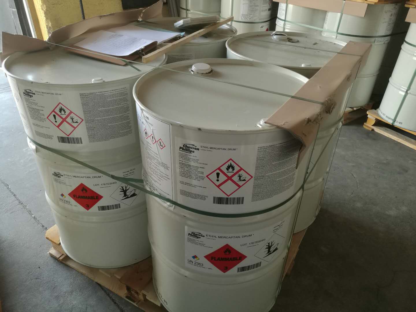 3.乙硫醇是重要的农药中间体,用于生产有机磷农药异丙磷、甲拌磷、乙拌磷、内吸磷、甲基内吸磷等。也可用于生产抗菌剂401。空气中基含乙硫醇仅五百亿分之一浓度时,其臭味就能觉察,因此可用作天然气及石油气的警告剂、试剂的加臭味剂(其臭味在浓度为0.00019mg/L时即可嗅到)。乙硫醇还可用于医药等有机合成。