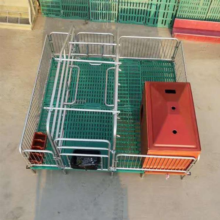 2.复合式有利于通风与观察,产床主架采用一寸热镀锌钢管焊接而成,母猪位宽度在60-70厘米,可以自由调节,适合不同体型的猪使用。铸铁退离地30公分,配带母猪小猪食槽饮水设备,小猪复合保温箱电热板,高承重复合钢筋漏粪板,大架可上翻,后期可做保育使用。