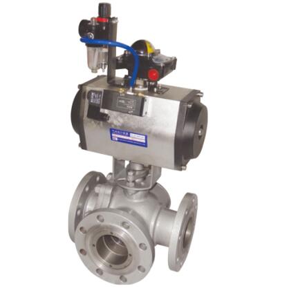 气动三通球阀可分为L形气动三通球阀和T形气动三通球阀,L形(Q44F)三通球阀用于介质流向的切换,能使相互垂直的两个通道连接;T形(Q45F)三通球阀用于介质分流、合流及流向切换。T形三通可以使三个通道相互连通或使其中的两个通道连通。三通球阀一般采用两阀座结构,亦可根据用户要求采用四阀座结构。