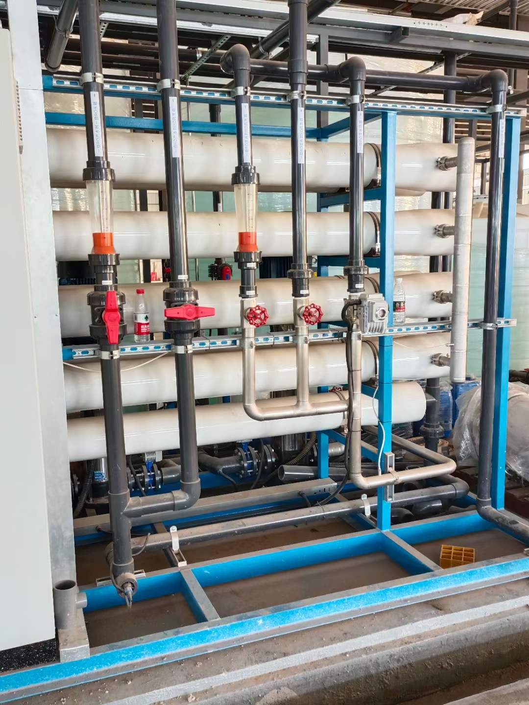 整个水处理系统分为预处理系统、反渗透为主的脱盐系统、精处理系统,达到超纯水水质。整个水处理系统有加热功能,根据不同的用水温度需要调整进水温度。预处理系统由絮凝剂和杀菌剂加药系统、全自动多介质过滤器、全自动活性炭过滤器、预处理产水箱、预处理输送泵组成。