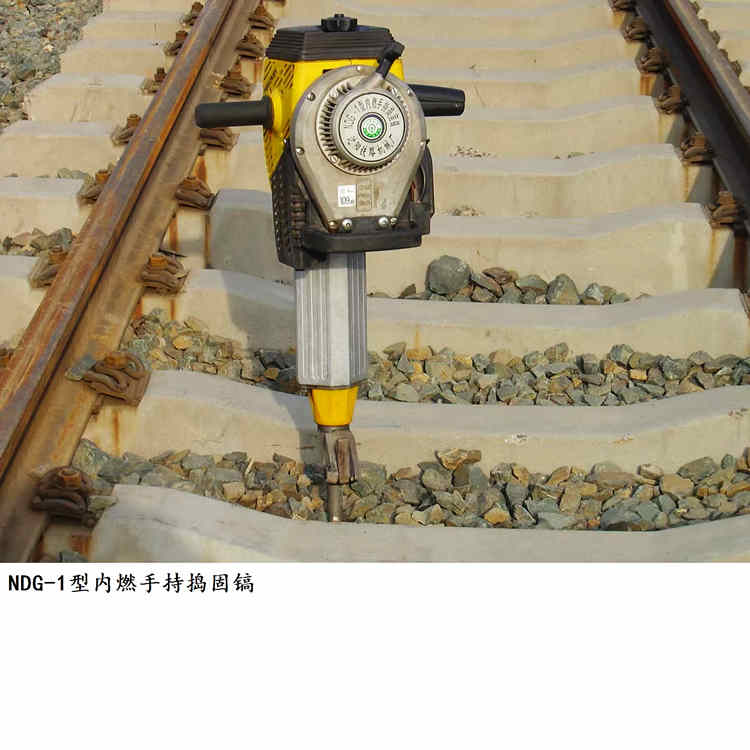 NDG-4型小型内燃捣固镐是一种适用于铁路线路道床石喳捣固作业的手提便携式专业工具。内燃捣固镐以汽油机做动力源,通过离心式离合器、橡胶减震器、拖动振动器产生高频扰动力,使枕下石喳重新排列密实,从而实现对道床石喳捣固的目的。该机设计新颖、结构紧凑、体积小、重量轻、机动性强、手把两级减震,手提便携、上下道方便,可不必封锁线路作业。内燃捣固镐特别适用于道岔、隧道、桥涵等大中型养路机械不能作业的道床区域性养路作业。