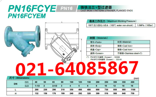 型号:EN16FCYE、 材质:铸铁、滤网:不锈钢304、压力:1.6MPA。温度:100度,口径:DN40-DN400