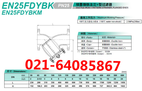 型号:EN25FDYBK、 材质:球墨铸铁、滤网:不锈钢304、压力:2.5MPA。温度:100度,口径:DN50-DN700