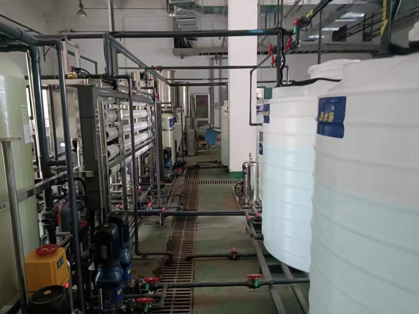 两级反渗透方式,其流程如下:原水→原水加压泵→多介质过滤器→活性炭过滤器→软水器→过滤器→一级反渗透→ph调节→中间水箱→二级反渗透→纯水箱→纯水泵→微孔过滤器→用水点