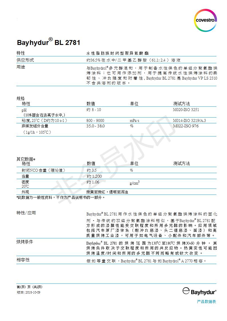 Bayhydur BL 2781 用 作 水 性 保 色 的 单 组 分 聚 氨 酯 烘 烤 涂 料 的 固 化剂 。 与 传 统 的 双 组 分 聚 氨 酯 涂 料 相 似 , 基 于Bayhydur BL 2781 配