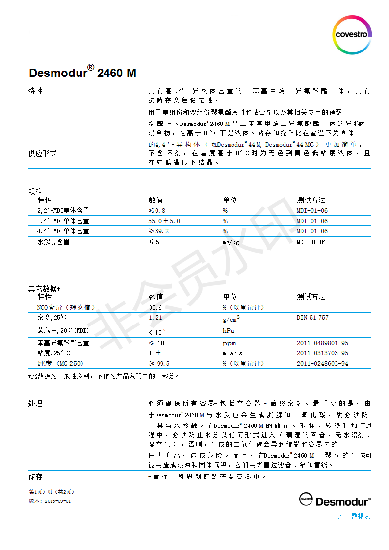 用 于 单 组 份 和 双 组 份 聚 氨 酯 涂 料 和 粘 合 剂 以 及 其 相 关 应 用 的 预 聚 物 配 方 。Desmodur 2460 M 是 二 苯 基 甲 烷 二 异 氰 酸 酯 单 体 的 异 构体 混 合 物 , 在 高 于20 °C 下 是 液 体 。 储 存 和 操 作 比 在 室 温 下 为 固 体