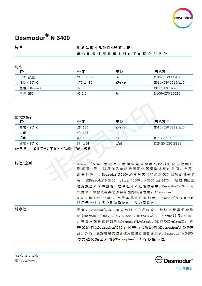通 常 ,Desmodur N 3400 可 以 和 以 下 产 品 混 合 : 脂 肪 族 聚 异 氰 酸 酯例 如Desmodur 100 ,N 75 ,N 3200 ,ultra N 3300 ,N 3600 以 及Z 4470; 芳 香 族 聚 异 氰 酸 酯 例 如Desmodur L/ultra L ,HL 以 及IL/ultra IL ; 羟基 聚 酯 例 如Desmophen 670 ; 羟 基 丙 烯 酸 酯 例 如Desmophen A 系 列产 品 。 然 而 , 最 好 在 每 次 混 合 使 用 前 进 行 相 容 性 测 试 。Desmodur N 3400 与 支 链 化 羟 基 聚 酯 如Desmophen 651 相 容 性 不 佳 。