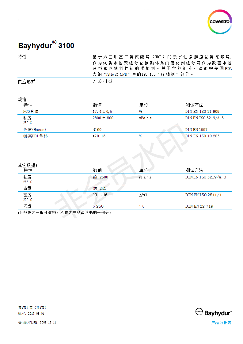 由 于Bayhydur 3100 具 有 亲 水 性 , 故 易 在 水 性 介 质 中 乳 化 。 该 产 品主 要 作 为 水 性 含 羟 基 多 元 醇 基 料 (Bayhydrol ) 的 交 联 剂 。 还 可将Bayhydur 3100 加 入 传 统 无 羟 基 的 分 散 体 中 , 以 改 善 其 特 性 。